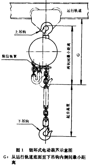 如圖1所示,起升額定載荷至限位裝置動作并處于停止?fàn)顟B(tài)時,測定上下吊鉤內(nèi)側(cè)間的距離。限位張志安裝在機體內(nèi)部的環(huán)鏈式電動葫蘆為下吊鉤起升到上極限位置的狀態(tài)。帶有運行小車的環(huán)鏈式電動葫蘆,測定運行工字梁軌道下翼緣底面至下吊鉤內(nèi)側(cè)間的距離。