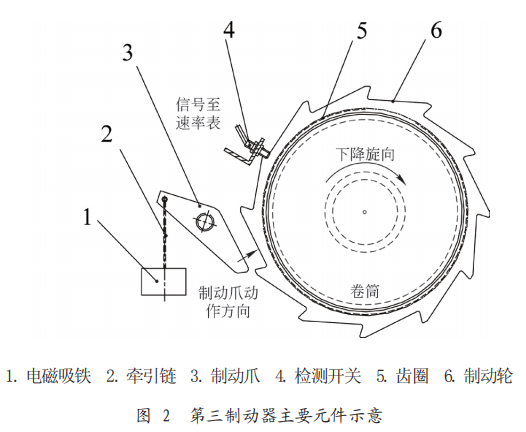第三制動器主要部件包括速度檢測開關、齒圈、牽引電磁鐵、速率表、制動爪與制動輪等,如圖2所示。