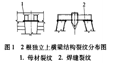 在一側支腿上方的上橫梁由2根獨立的小箱形梁(或工字鋼)結構組成,如圖1所示。產生裂紋的原因為應力集中、受力不均勻及剛度不足。
