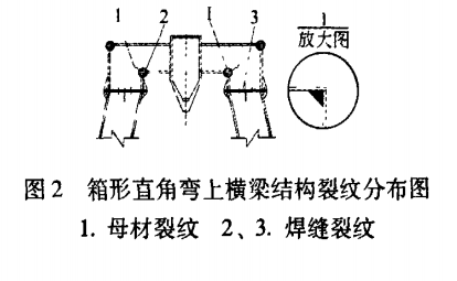 上橫梁彎折處裂紋,采用不合理的90°彎折,如圖2所示。上橫梁的下蓋板角焊縫及腹板產生裂紋,主要是因為應力集中引起。