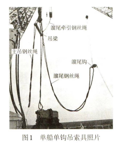 根據樁長、樁重、水深、吊耳高度及吊距,選用單鉤起重船。吊索具配置有溜尾鉤、溜尾鋼絲繩、溜尾牽引鋼絲繩、吊梁及主吊鋼絲繩等。先采用卡環將溜尾鉤與溜尾鋼絲繩連接;然后將吊梁、主吊鋼絲繩、溜尾鋼絲繩掛在主鉤上;然后采用牽引鋼絲繩將溜尾鋼絲繩上端與副鉤相連,見圖1。