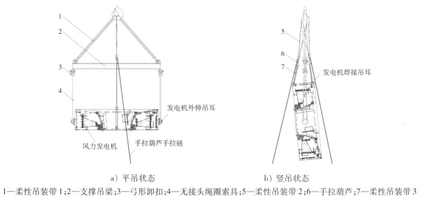 先將柔性吊裝帶穿入弓形卸扣中,再將弓形卸扣安裝于支撐吊梁的2個上吊耳上,然后將柔性吊裝帶掛入起重吊鉤中;將無接頭繩圈索具穿入弓形卸扣中,再將弓形卸扣安裝于支撐吊梁的2個下吊耳上。所有零部件裝配完成后,將無接頭繩圈索具與發(fā)電機(jī)外伸吊耳相連接,手拉葫蘆吊索上的卸扣與發(fā)電機(jī)焊接吊耳相連,然后起吊,起吊至空中后,由2個工作人員在發(fā)電機(jī)兩側(cè)拉伸手拉葫蘆的手拉鏈,直至翻轉(zhuǎn)至圖1b所示的豎吊狀態(tài),發(fā)電機(jī)翻身過程完成。