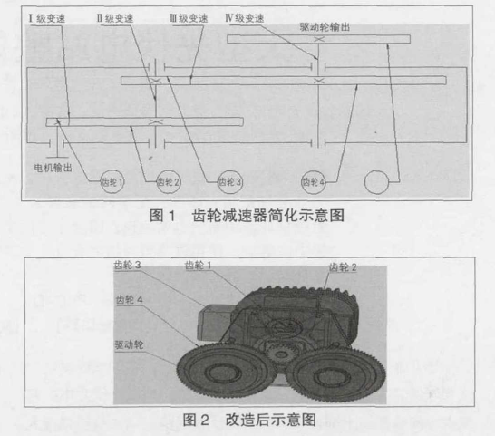 齒輪減速器可簡(jiǎn)化為如圖1所示。要提升驅(qū)動(dòng)力的輸出轉(zhuǎn)速,有4種更改方法可以實(shí)現(xiàn):1、改變I級(jí)減速比,增大齒輪1,減小齒輪2;2、改變II級(jí)減速比,減小齒輪2,增大齒輪3;3改變III級(jí)減速比,增大齒輪3,減小齒輪4,;4改變IV級(jí)減速比,減小齒輪5,增大驅(qū)動(dòng)輪。