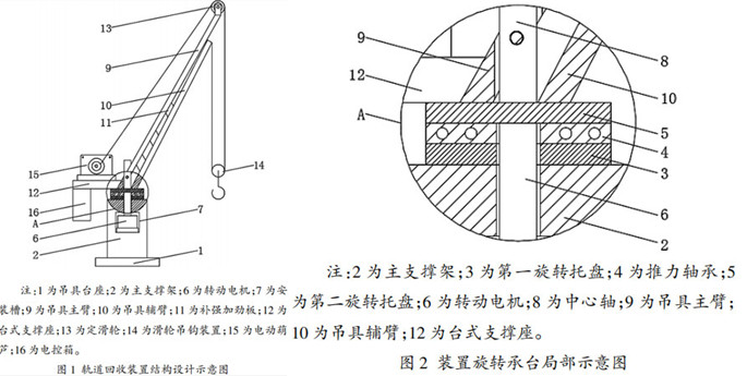 主支撐架的上部設有帶轉(zhuǎn)動電機安裝槽,轉(zhuǎn)動電機的輸出端依次貫穿安裝 槽的上側(cè)壁、推力軸承和第一旋轉(zhuǎn)托盤與帶中心軸的 第二旋轉(zhuǎn)托盤固定連接。中心軸上固定連接有包括吊具主臂和吊具輔臂的吊具臂,吊具主臂與中心軸通過螺栓固定連接,吊具主臂和吊具輔臂之間設有若干補強加勁板。吊具主臂的一側(cè)設有上端帶電動葫蘆臺式 支撐座和定滑輪,吊具輔臂的一側(cè)設有滑輪吊鉤裝置,電動葫蘆的鋼絲繩端依次貫穿定滑輪和滑輪吊鉤裝置 后與吊具輔臂的上端固定連接,滑輪吊鉤作用在待回收的軌道上通過電動葫蘆和鋼絲繩作用定滑輪,使得 滑輪吊鉤對待回收軌道進行提吊拖拉,通過旋轉(zhuǎn)電機能夠驅(qū)動第二旋轉(zhuǎn)托盤及與其相連接的吊具臂旋轉(zhuǎn),待回收軌道提拉旋轉(zhuǎn)至合適位置后,將待回收軌道放置于軌道運輸平車上,完成鋼混橋梁的架橋機軌道回收。臺式支撐座的下端設電控箱,通過電控箱對電動葫蘆和轉(zhuǎn)動電機進行控制,電控箱分別與電動葫蘆和轉(zhuǎn)動電機電性連接。電控箱的表面設有防腐涂層,通過防腐涂層能夠讓電控箱在施工現(xiàn)場的較差環(huán)境中具有更長的使用壽命。吊具臺座的底部設有防滑墊,通過防滑墊能夠讓本裝置在使用時更加穩(wěn)定。吊具臺座的內(nèi)部設有重力塊,通過重力塊能夠讓本裝置在使用時更加穩(wěn)定。