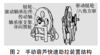 其中,鏈輪主要用于纏繞手拉葫蘆的鏈條,在受到驅動力時拉動鏈條運動,該鏈輪齒節為標準齒節,針對于非標或大型 鏈條可配備專用鏈輪。滾動軸承組件主要和軸承座配合起到固定 和支撐的作用。導向滑輪在鏈輪兩側各有一個,主要對鏈條起導 向作用,協助鏈輪拉動鏈條。驅動鏈輪主要用于外接電機驅動時連接使用。六角方驅主要用于外接氣動扳手的套筒,給裝置提供動力。此外,本裝置還 有一個較大的優點在于其制造成本低廉,裝置中鏈輪、滾動軸 承組件、傳動軸、軸承 座支架和驅動方驅均可使用化工廠現有廢 舊材料利廢制作。其中鏈輪可由廢舊手拉葫蘆制作,滾動軸承組 件和傳動軸可用維修機泵替換下來的舊軸承和舊軸加工制作, 軸承座支架也可由現場普遍存在的角鋼焊接制造,且制造工藝 較為簡單,可以由化工廠維修車間自行制造并予以使用。