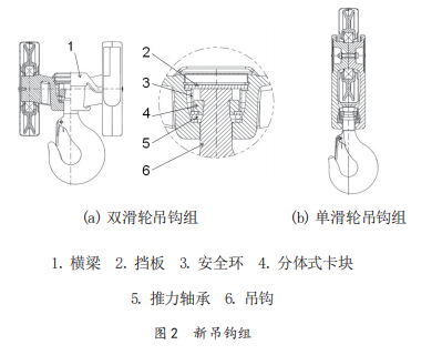 新設(shè)計(jì)的吊鉤組在總體結(jié)構(gòu)、外形、材料、機(jī)加工及使用功能等多個(gè)方面進(jìn)行了優(yōu)化。總體結(jié)構(gòu)詳見圖 2。對于雙滑輪吊鉤組,采用特殊設(shè)計(jì)的橫梁,將傳統(tǒng)的滑輪軸及吊鉤橫梁功能合二為一,減少了零部件數(shù)量,簡化了裝配工藝。另外該設(shè)計(jì)可以使用標(biāo)準(zhǔn)吊鉤并實(shí)現(xiàn)最小的整體高度尺寸。使用分體式卡塊替代螺紋連接,省去了吊鉤螺母,改善應(yīng)力集中,避免配做簡化裝配。設(shè)置鋼絲繩保護(hù)裝置并且在設(shè)計(jì)中盡可能的降低吊鉤組重心,即保護(hù)了鋼絲繩又能最大程度的避免空鉤偏斜的問題。對于單滑輪吊鉤組,將滑輪軸、拉板及吊鉤橫梁整合為一個(gè)零件,并且采用分體式結(jié)構(gòu),進(jìn)一步簡化了零件數(shù)量和裝配流程。卡塊及吊鉤組為系列化設(shè)計(jì),盡量通用,減少了整個(gè)系列的零部件數(shù)量。