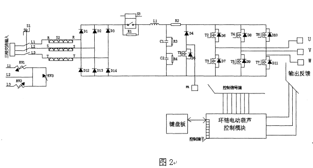 如圖1、圖2所示,環(huán)鏈電動葫蘆智能控制器,包括整流模塊、逆變模塊和控制模塊,整流模塊和逆變模塊線路連接后分別與控制模塊線路連接,逆變模塊與環(huán)鏈葫電動蘆的電機(jī)線路連接,控制模塊與環(huán)鏈電動葫蘆的鍵盤板線路連接。