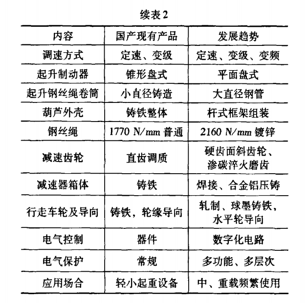 鋼絲繩電動(dòng)葫蘆之后的發(fā)展方向應(yīng)向重載、大型、高性能化、模塊化發(fā)展,成為替代通用橋式起重機(jī)的發(fā)展趨勢(shì)。新一代的電動(dòng)葫蘆與現(xiàn)有產(chǎn)品的構(gòu)造特征對(duì)比表如下: