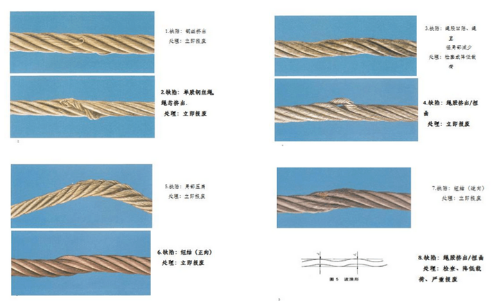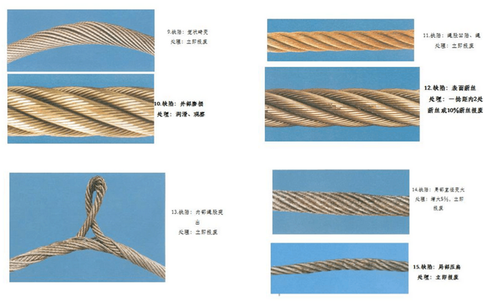 上面的圖片可以清楚的看出哪些鋼絲繩是需要報(bào)廢的,哪些是需要減少起重量來進(jìn)行起吊的。鋼絲繩在上述所述立即報(bào)廢的情況下,需要立即報(bào)廢。否則會(huì)產(chǎn)生一些致命的危險(xiǎn)。