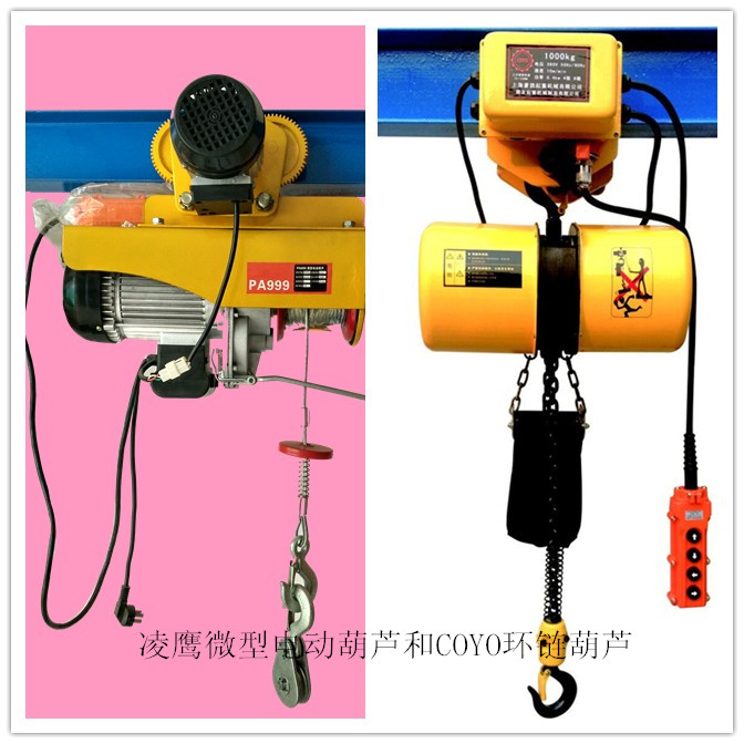 微型電動(dòng)葫蘆也可以分為鋼絲繩電動(dòng)葫蘆和環(huán)鏈電動(dòng)葫蘆兩種。鋼絲繩電動(dòng)葫蘆就是上面說到的PA型電動(dòng)葫蘆。而環(huán)鏈微型電動(dòng)葫蘆,指的是COYO型環(huán)鏈電動(dòng)葫蘆。