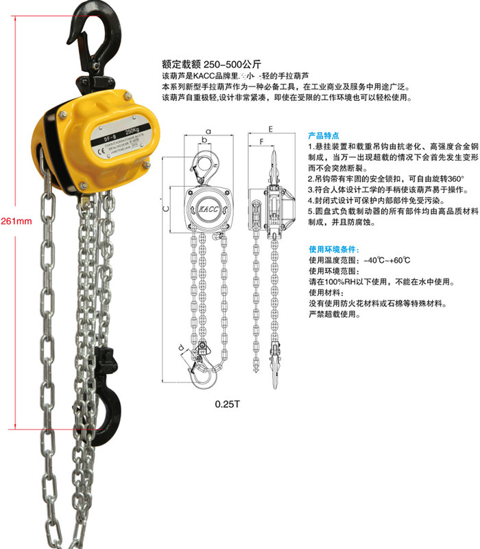 1、 ?懸掛裝置和載重吊鉤由抗老化、高強度合金鋼制成,當萬一出現超載的情況下會首先發生變形而不會突然斷裂。